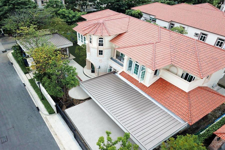 สำหรับวัสดุมุงหลังคาที่จะให้รูปลักษณ์ที่เน้นความหรูหราโมเดิร์น สร้างความโดดเด่นและแตกต่างให้เจ้าของบ้าน ที่นิยมใช้จะเป็นวัสดุมุงหลังคาชนิดแผ่นเรียบ KS CozySeam Sandwich Panel